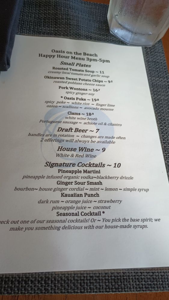 Introducing the menu at Oasis on the Beach, a gem in Kapaʻa, HI, where New American cuisine meets the serene beauty of oceanfront dining. This restaurant prides itself on farm-fresh ingredients, creating a menu that brings a burst of flavor to every dish.